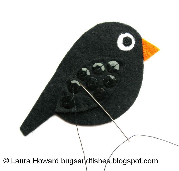 For Mr Blackbird, sew rows of round black sequins on the blackbird’s wing using black sewing thread. Sew each sequin in place with two stitches forming a straight line across the sequin, so your stitches face the same direction.